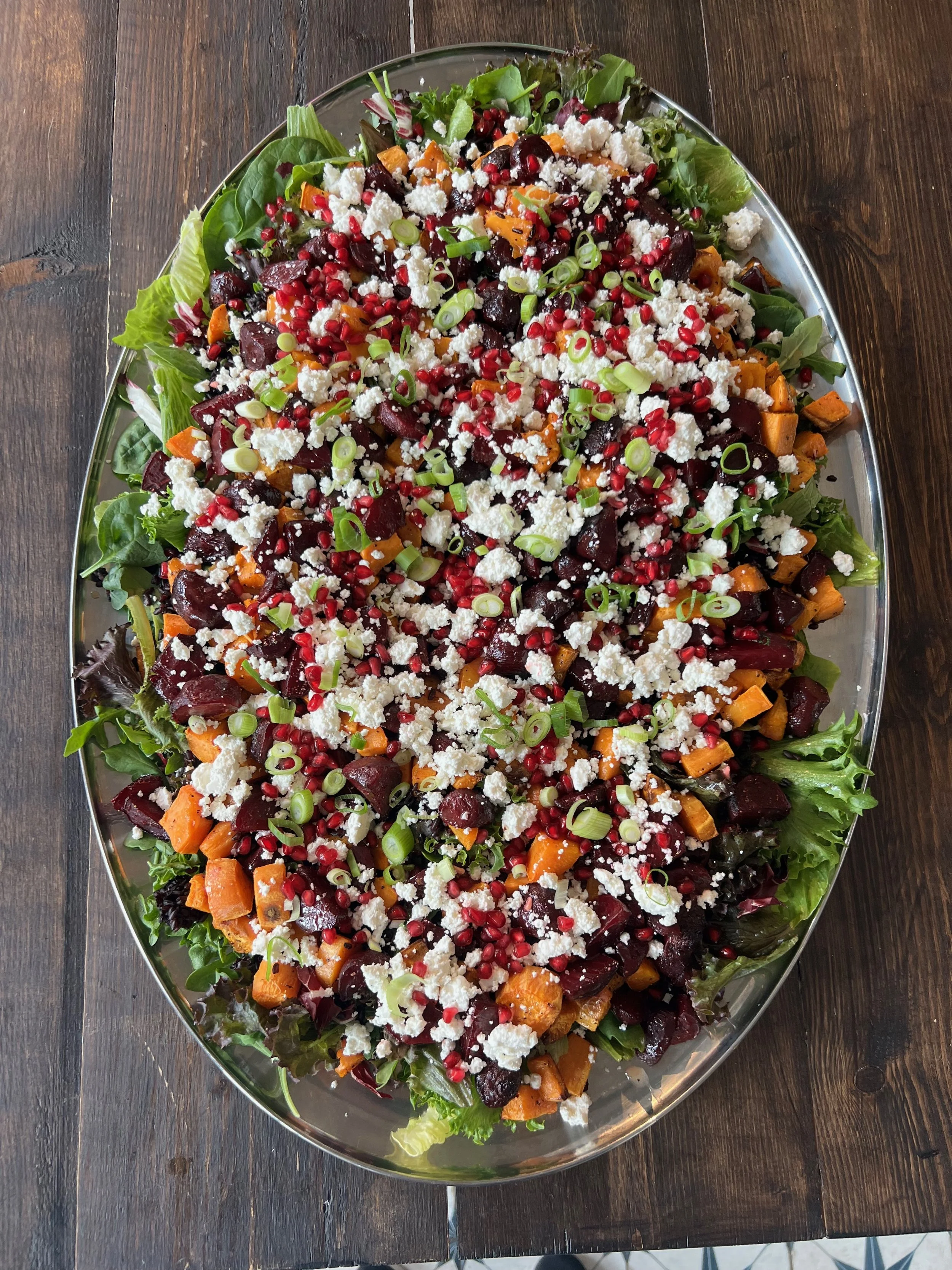 SVARTRISSALLAD MED BAKAD SÖTPOTATIS, RÖDBETOR, GRANATÄPPLEN M HONUNG- & GRANATÄPPLEVINAIGRETTE